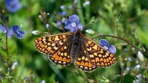 Dyr som kan opleves i Bredevandsbakker: Hedepletvinge (øverst til venstre), natravn (øverst til højre),trane (nederst til venstre), natravn (nederst til højre)